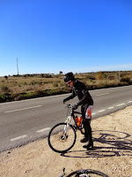 Feito isto combinamos com os carros de apoio que parassem ao fim de 25km´s e depois logo se via o que faziamos. Pecorremos estes 25km que nos levaram através da Zambujeira do Mar, passando pelo recinto do Festival do Sudoeste e parando perto de São Teutónio. Pessoalmente para mim estes foram os km´s mais dificeis. Dos 4 que seguiamos no grupo 1 tinha bicicleta de estrada. Nesta etapa decidi acompanha-lo e puxar um pouco também tendo feito estes km´s a um ritmo rápido o que elevou a minha FC para os 160-170bpm´s, também porque nesta zona apanhamos bastante vento frontal e uma inclinação quase constante de 2 a 3% que não mata, mas ajuda. Pouco depois das 12h estavamos em São Teutónio com 125km feitos e com uma média nesta etapa de quase 28km/h. Paramos mais 10 minutos. Neste ponto tinhamos feito a parte mais plana do percurso. Íamos encontar pela frente a entrada no Algarve algumas serras que tinhamos que contornar.